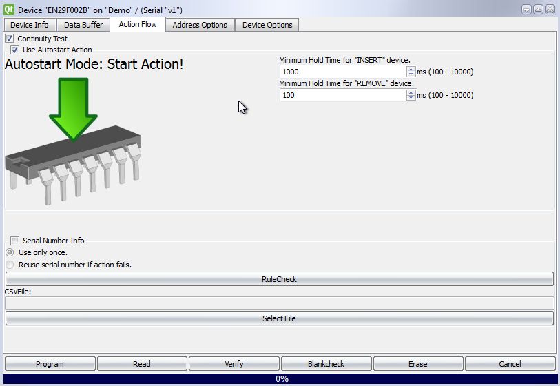 [Continuity Test] checks if the device is correctly inserted and all socket pins are connected. Otherwise an error message will pop up at the beginning of a device action.