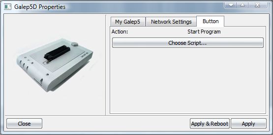 The Programmer Properties panel allows to set an individual programmer name, change the IP address, or assign a script to the front button. If no script is assigned, the front button automatically starts the [Program] action of the current Device Window. Some settings, f.i. changing the IP address, require rebooting the programmer.