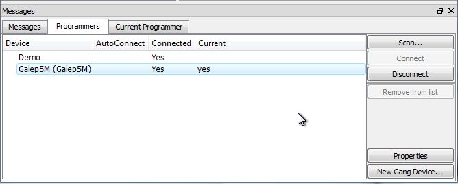 | Scan | Opens the Connect Programmers panel. GALEP-5D programmers connected over the network are automatically detected and added to the list. GALEP-5 programmers can be manually connected. |